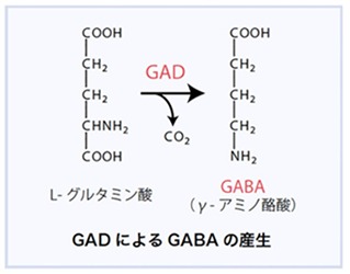 そのGABAはグルタミン酸からグルタミン酸脱炭酸酵素(GAD)によって生産されます。GADには、GAD65とGAD67の2種類あり、後者は真皮の線維芽細胞に存在し、加齢によりGADは減少し、皮膚の老化にもつながります。