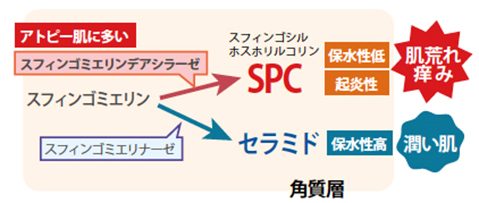 しかし、「乾燥肌について(概論)」のページに書いていますように、アトピーではスフィンゴミエリンからSPC(スフィンゴシルフォスフォリルコリン)を合成する酵素(スフィンゴミエリンデアシラーゼ)の活性が異常に高くなっており、セラミドよりSPCの方を多く合成してしまいます。
