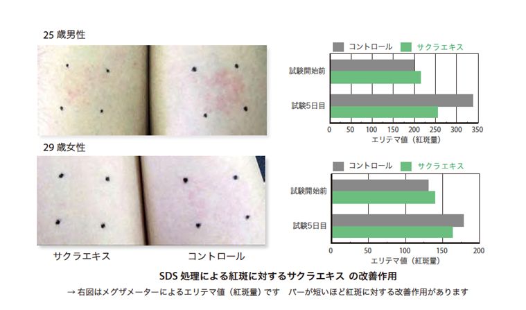 界面活性剤の刺激による肌荒れに対する、サクラの葉エキスの改善作用を調べた結果です。ラウリル硫酸ナトリウム(SDS:界面活性剤の1つ)を被験者の前腕屈側に5分間閉塞塗布を5日間行い、その後、サクラの葉エキスを塗った場合の改善度をコントロールと比較した結果です。