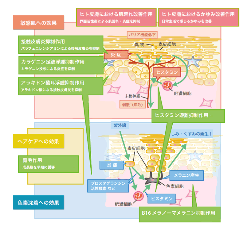 サクラの葉エキスには、以上の他に、パラフェニレンジアミンによって引き起こされる接触皮膚炎などにも効果があることが認められています。また育毛作用もあります。